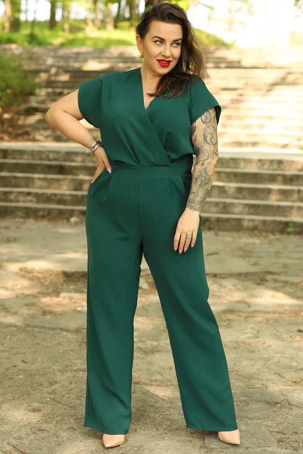 Elegantní jednodílný overal Olka je naprostým hitem, který odpovídá nejnovějším módním trendům. Jednoduchý střih s krásným obálkovým výstřihem, výrazným vykrojením v pase a malými záhyby v pase způsobí, že v něm bude každá žena vypadat úžasně. Dlouhé a široké nohavice navíc zeštíhlují siluetu a působí lehce, takže i dámy s plnější postavou se v tomto oblečení budou cítit mimořádně pohodlně. Kombinéza Olka je ideální alternativou ke klasickým šatům, stejně jako dvoudílné soupravy složené z halenky a kalhot nebo sukně. Jeho největší výhodou je, že se jedná o kompletní styling a vše, co musíte udělat, abyste vypadali dokonale, je postarat se o doplňky. A v tomto předmětu je naprostá svoboda. V závislosti na příležitosti a vašich potřebách můžete kombinovat kombinézu Olek s jehlovými podpatky, sandály na platformě, malými lodičkami na jehlovém podpatku nebo dokonce s teniskami a žabkami. Klasický vzhled se hodí do kanceláře, na rodinnou večeři nebo na svatbu kamarádky. Sportovní verze je ideální na procházku, nákupy, do kina nebo na venkovní koncert.
