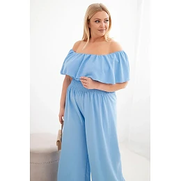 Dámský overal Plus Size s odhalenými rameny, s volánem a širokými nohavicemi modrý