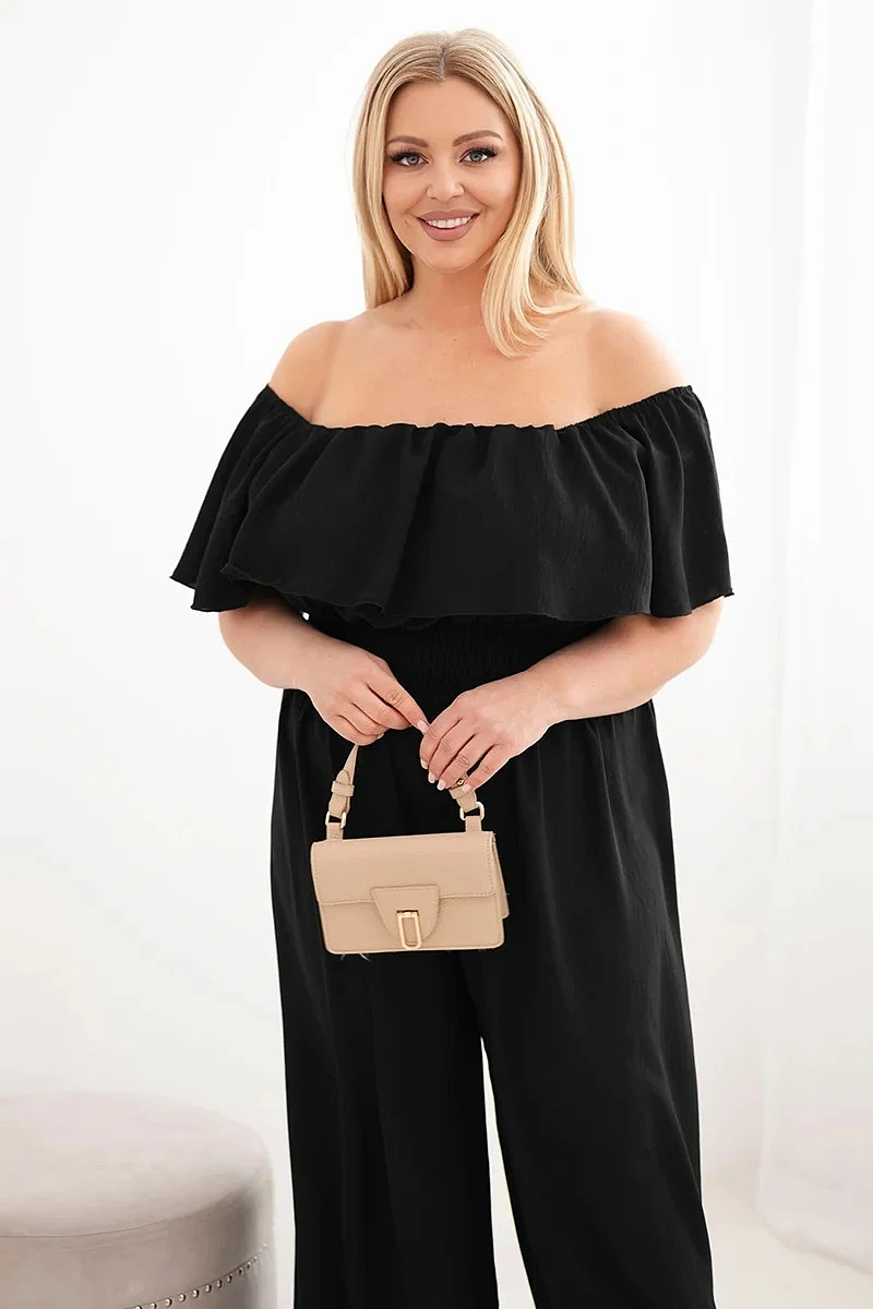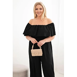 Dámský overal Plus Size s odhalenými rameny, volánem a širokými nohavicemi černý