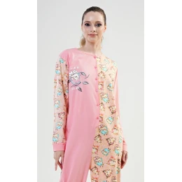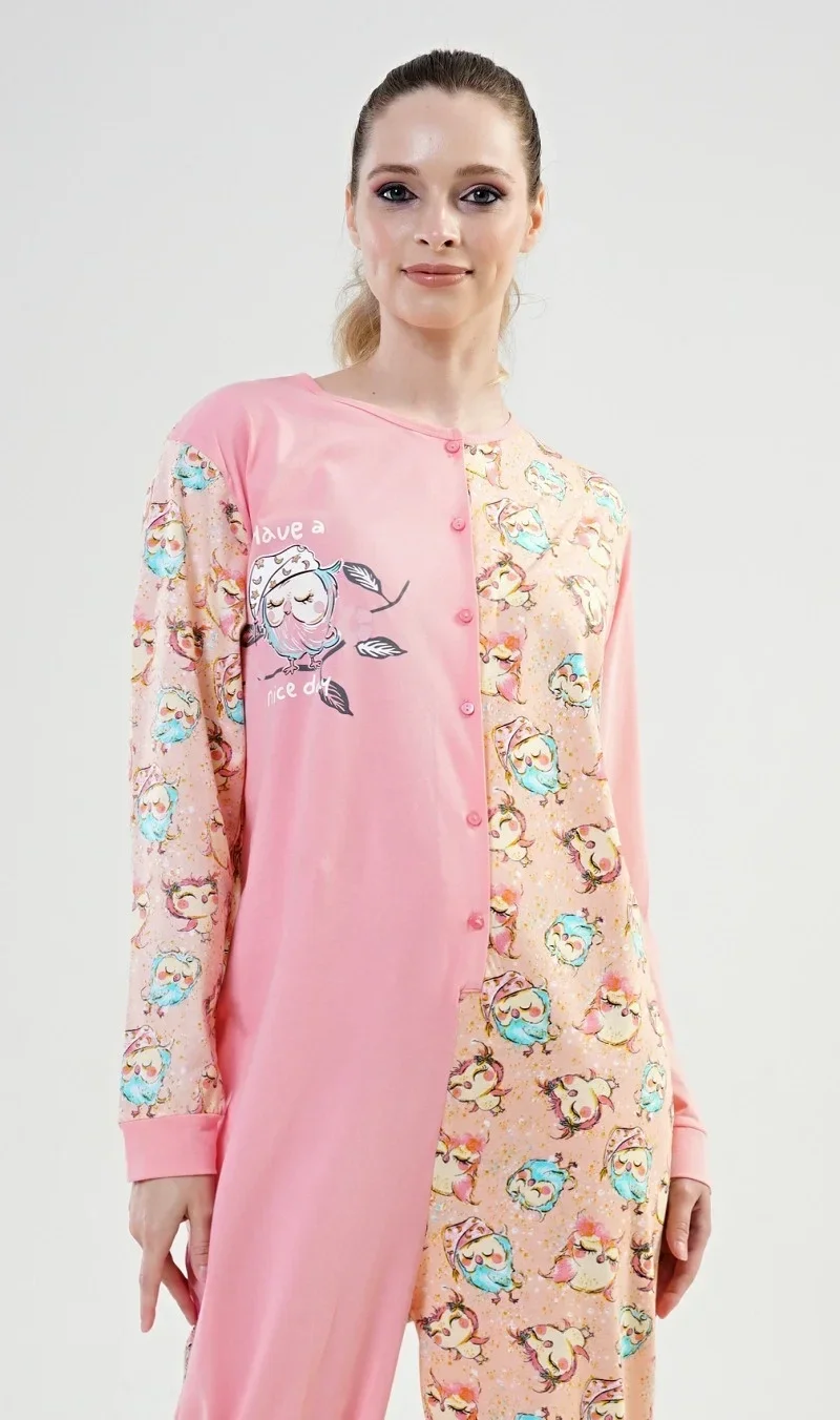 Dámský bavlněný overal Sovičky. Overal je celopropínací - z jedné strany zdobený obrázkem sovy s čepičkou, z druhé strany celoplošným potiskem soviček. Dlouhé nohavice jsou ukončeny elastickými lemy. Bavlněný materiál je poddajný a příjemný na dotek.