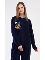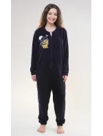Dámský polarový overal Tygřík. Dámský overal má kulatý výstřih a zapínání na zip. Rukávy a kalhoty jsou zakončeny praktickými lemy. Decentní overal zdobí aplikace s motivem malého tygra, který má na sobě čepici s velkou bambulí. Na tmavě modrém podkladu je vyšitý nápis. Použitý materiál je hřejivý a poddajný na dotek, obzvláště ho oceníte v chladných zimních dnech.