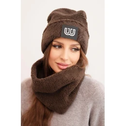 Dámský polarový komplet čepice a nákrčník s ozdobnou nášivkou hnědý