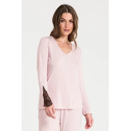 Krajkové vsadky a na dotek jemná viskózová tkanina byly zkombinovány tak, abyste se cítili výjimečně a elegantně, i když jdete spát. Tento pyžamový top s dlouhými rukávy nejlépe vypadá v kombinaci s našimi pyžamovými kalhotami s dlouhými nohavicemi a krajkovými vsadkami. Viskózový úplet. Pyžamový top s dlouhými rukávy. Výstřih ve tvaru V. Dlouhé rukávy s krajkovými vsadkami. Naše modelka je 172 cm vysoká a nosí velikost S.