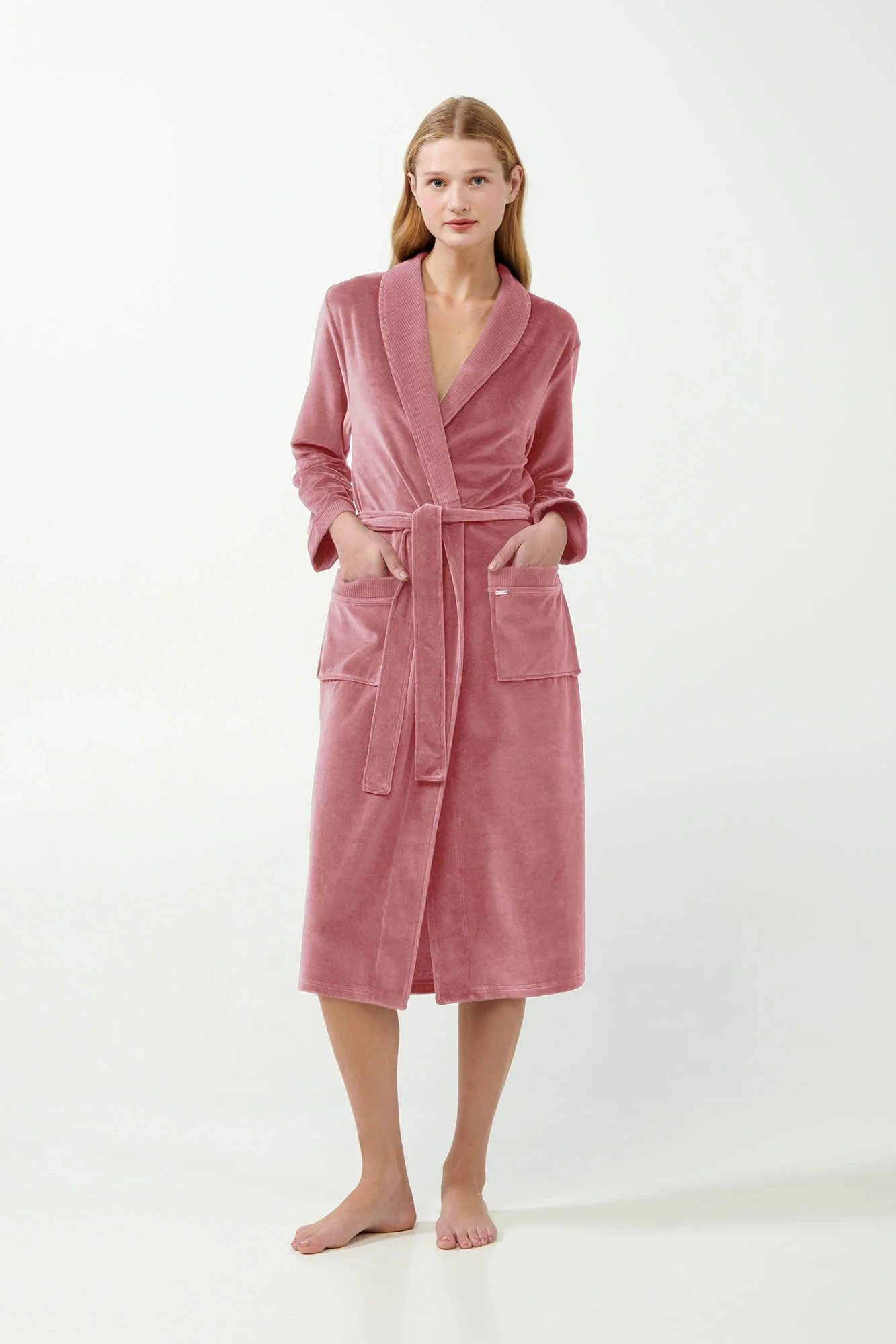 Dopřejte si luxusní pohodlí s tímto dlouhým dámským županem, který je vyroben z měkkého sametu bohatého na bavlnu. Župan má překřížený design s odpovídajícím páskem pro nastavitelné přizpůsobení spolu s praktickými kapsami pro větší pohodlí. Žebrovaný v klopě lem dodává županu nádech sofistikovanosti, takže je ideální pro útulné večery doma. Tento župan kombinuje eleganci s hřejivostí, což vám zajistí styl a pohodlí.