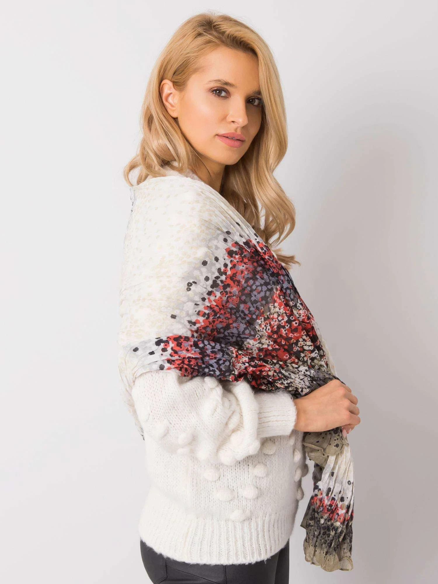 Khaki-červený vzorovaný šátek.