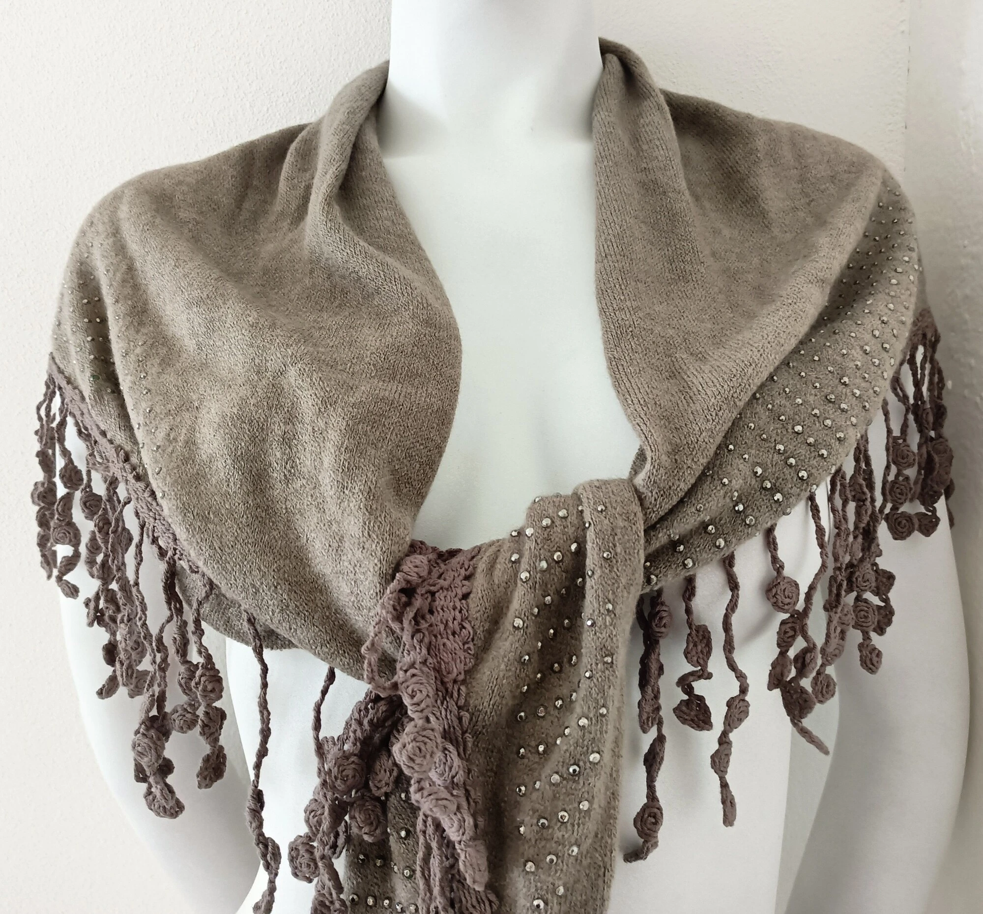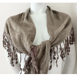 Dámský trojhranný šátek posetý kamínky. Na bocích třásně.