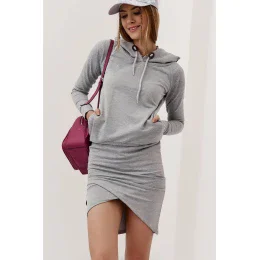 Šedá souprava bude ideální pro dny, kdy nebudete vědět, jak ji stylizovat. Mikina s kapucí, dlouhými rukávy a kapsami. Asymetrická sukně s obálkovým předním dílem a elastickým pasem. Tento model vám umožní experimentovat a vytvářet nekonečné množství looků.