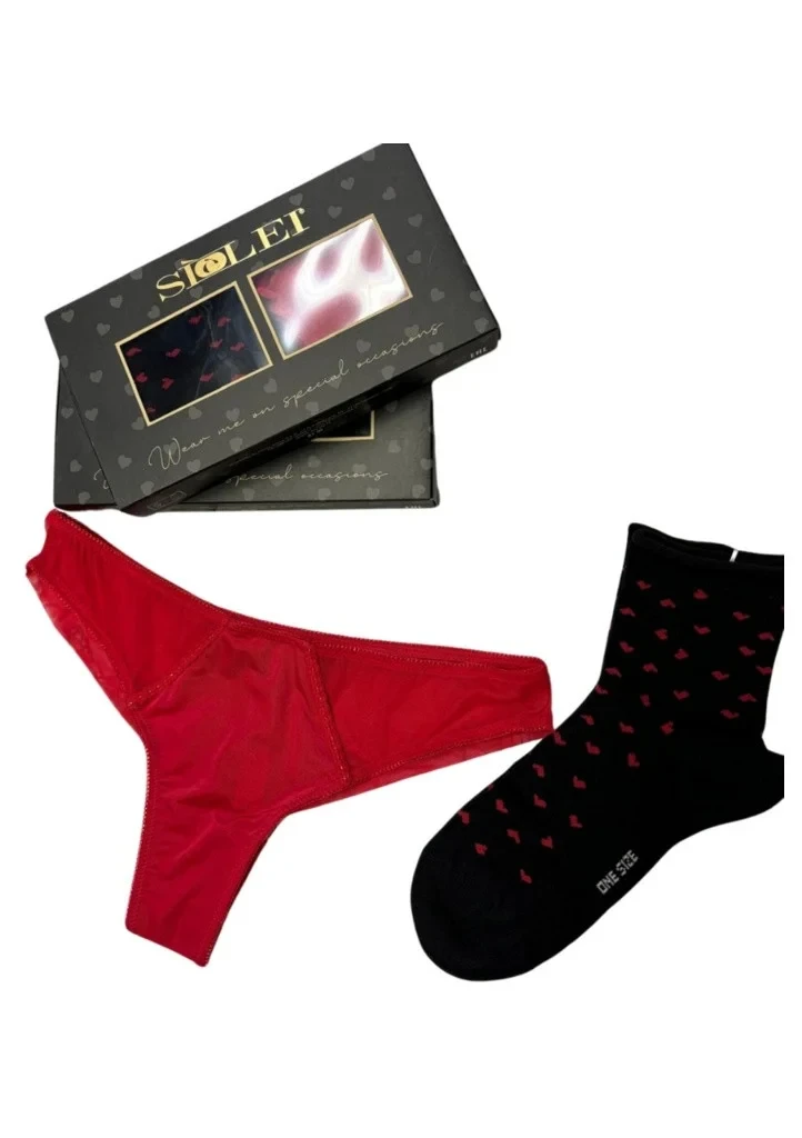 Dámský dárkový set kalhotky a ponožky značky Siélei. Tento set může být i krásným dárkem pod stromeček. Kalhotky jsou brazilkového střihu, v přední části jsou kalhotky z mikrovlákna a na bocích je tyl, který dále pokračuje do zadní části. Vpředu je ozdobné lemování se zlatou nití. Uvnitř je bavlněný klín pro komfortní nošení. Ponožky mají volný ohrnovací lem okolo nohy. Po celé ploše jsou malá srdíčka. Velikost ponožek je UNI.