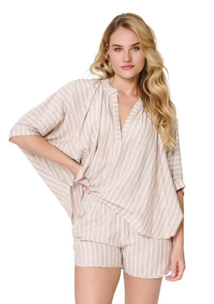 Stylový dámský komplet LingaDore je ideální volbou pro letní dny, dovolenou o pohodlné domácí nošení. Set tvoří volnější top a krátké šortky, které společně vytvářejí lehký a elegantní outfit. Díky příjemnému viskózovému materiálu je komplet velmi pohodlný, prodyšný a příjemný na dotek. Oversize top působí uvolněně a moderně, zatímco šortky mají elastický pas pro pohodlné přizpůsobení postavě a praktické kapsy. Tento letní komplet je skvělý například jako stylové plážové oblečení nebo lehký domácí outfit.