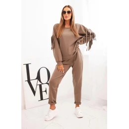 Elegantní dámský komplet v máslové barvě je kombinací pohodlí a módního designu. Mikina volného střihu je ozdobena efektními třásněmi na rukávech, které jí dodávají výjimečný charakter. Vyrobena z příjemného na dotek, elastického úpletu, zajišťuje volnost pohybu a komfort nošení. Kalhoty s elastickým pasem a regulací na šňůrku zaručují dokonalé přizpůsobení, a jejich jednoduchý střih skvěle ladí s mikinou. Tento komplet se hodí jak do každodenních stylizací, tak při setkání s přáteli.