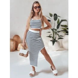Tento dámský pruhovaný komplet je ideální pro teplejší dny. Krátký top se silnějšími ramínky a klasickým výstřihem má moderní vzhled, zatímco vypasovaná maxi sukně s vysokým pasem a poutavým rozparkem dodává charakter. Pruhovaný vzor opticky zeštíhluje siluetu. Univerzální velikost je vhodná pro velikosti XS až L. Materiál je příjemný na dotek, pružný a dokonale se přizpůsobí tělu, což zajišťuje volnost nošení v teplých dnech.