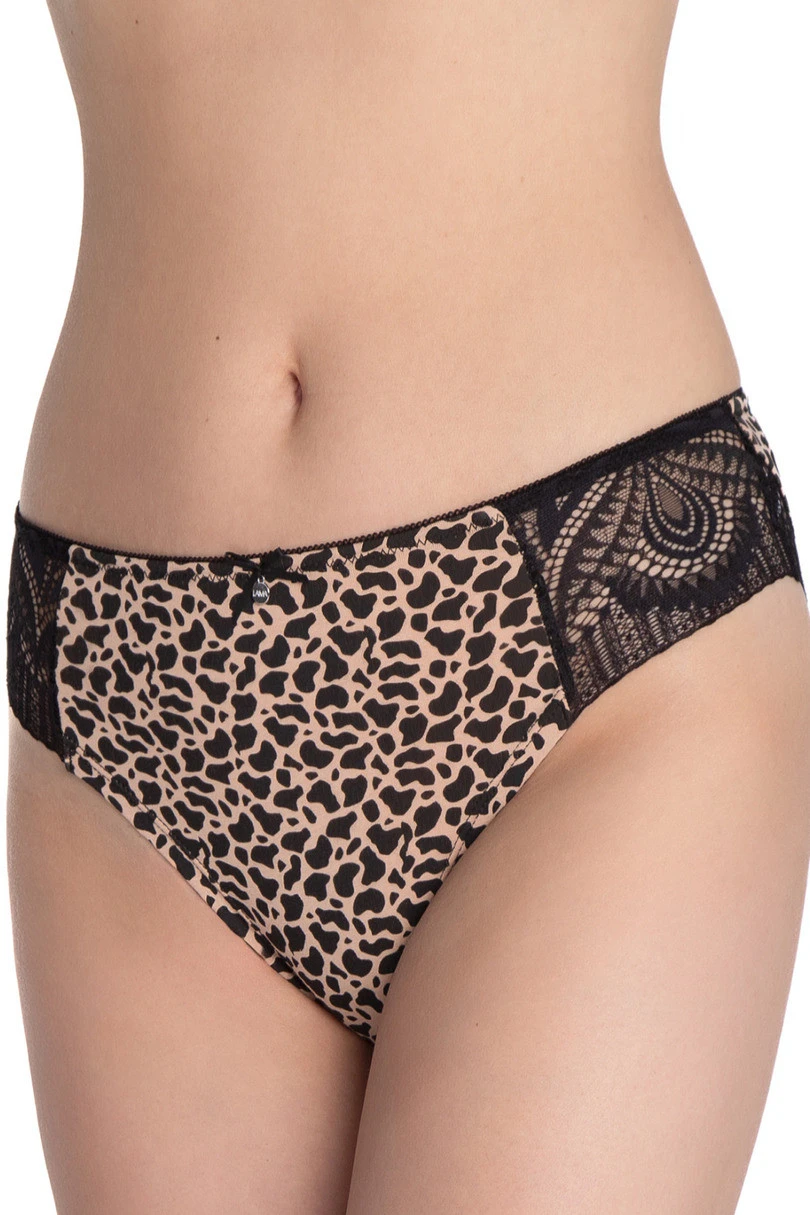 Figi LAMA w efektowny wzór panterki to propozycja dla kobiet, które cenią sobie połączenie modnego designu i komfortu noszenia. Model wykonano z miękkiej, przyjemnej w dotyku tkaniny, która idealnie dopasowuje się do sylwetki. Po bokach znajdują się wstawki z misternie zdobionej koronki, które nadają bieliźnie elegancji i delikatności. Figi świetnie sprawdzą się zarówno na co dzień, jak i jako element stylowego kompletu z dopasowanym biustonoszem. To idealny wybór dla kobiet lubiących podkreślać swój charakter poprzez detal.