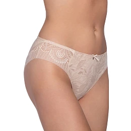 Přední strana kalhotek je hladká a minimalistická, díky čemuž je prádlo pod oblečením neviditelné. Boky zdobí jemná květinová krajka, která celku dodává lehký a ženský charakter. Dalším akcentem je malá mašlička s ozdobným detailem umístěná na přední straně.