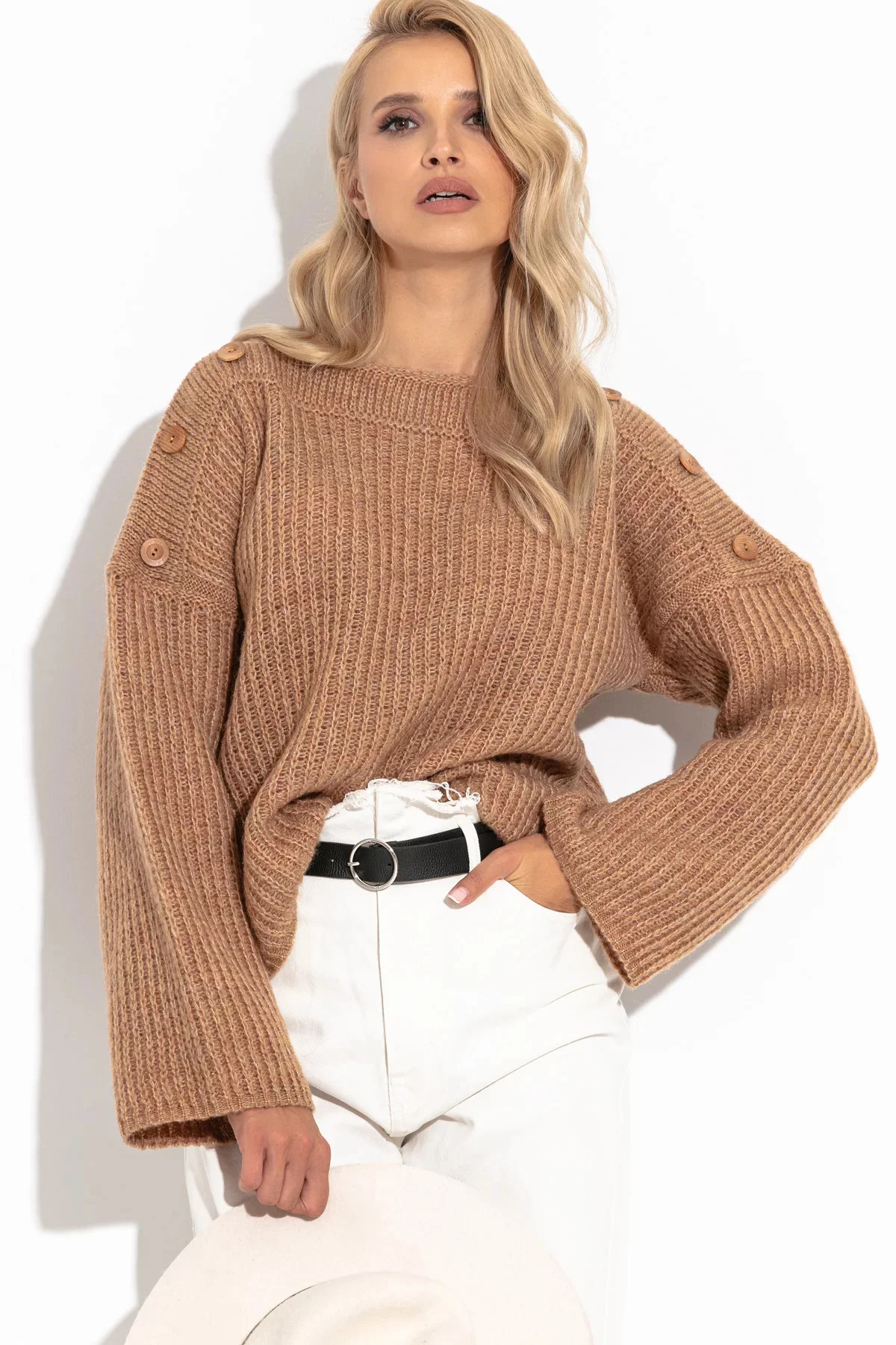 Pokud si vyberete klasiku v podzimních stylizacích, jistě si oblíbíte jemný, na dotek příjemný, měkký svetr s pohodlným, volným střihem. Jemná ecru, karamelová a černá barva, nebo snad ohnivě oranžová? Který z nich si vyberete ve svém oblečení? Lodičkový výstřih, knoflíky na ramenou v odstínu přírodního dřeva dodávají klasickému svetru charakter. Vypadá perfektně v kombinaci s širšími kalhotami, ale také odvážněji přes saténové mini šaty.
