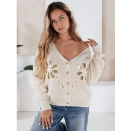Svetr na knoflíky, zdobený flitrovými květinovými aplikacemi. Měkká tkanina a volnější střih poskytují pohodlí, zatímco ozdobné detaily upoutají pozornost. Skvěle se hodí pro přechodné období, hodí se k džínům i sukním.