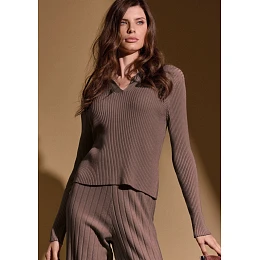 Dámská mikina v jemném hnědém odstínu má elegantní a nadčasový vzhled. Žebrovaný úplet působí velmi ženským dojmem a zároveň je příjemný na dotek. Střih s límečkem a výstřihem do V dodává modelu sofistikovaný charakter a krásně zvýrazňuje siluetu. Dlouhé rukávy zajišťují pohodlí při nošení a mikina se skvěle hodí jak na domácí relax tak i na běžné denní nošení.