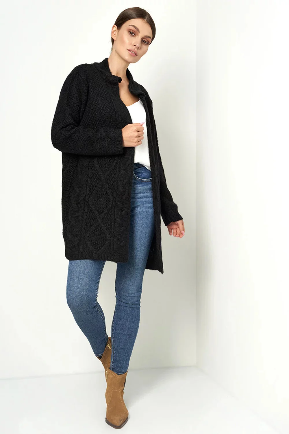 Víza se stojáčkem. Kardigan je nepostradatelnou součástí podzimního oblečení. Originální vazba dodává svetru jeho charakter.