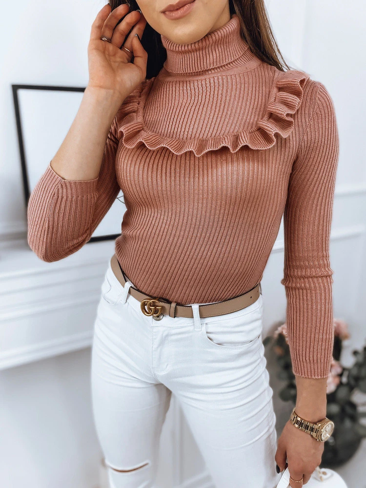 Tento svetr se vyznačuje jemným holenkovým výstřihem, žebrovaným materiálem s příjemným omakem a minimalistickým designem a ozdobnými volánky v podobě žabek. S tímto svetrem, který je k dispozici v mnoha barvách, vytvoříte ležérní i společenský vzhled.