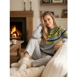 Hřejivý svetr s jedinečným vzorem ve skandinávském stylu, ideální pro chladnější dny. Měkká a na dotek příjemná tkanina zajišťuje pohodlí, zatímco nadčasový design se dobře kombinuje s džínami nebo sukněmi. Dokonalá volba pro milovníky elegance a pohodlí.