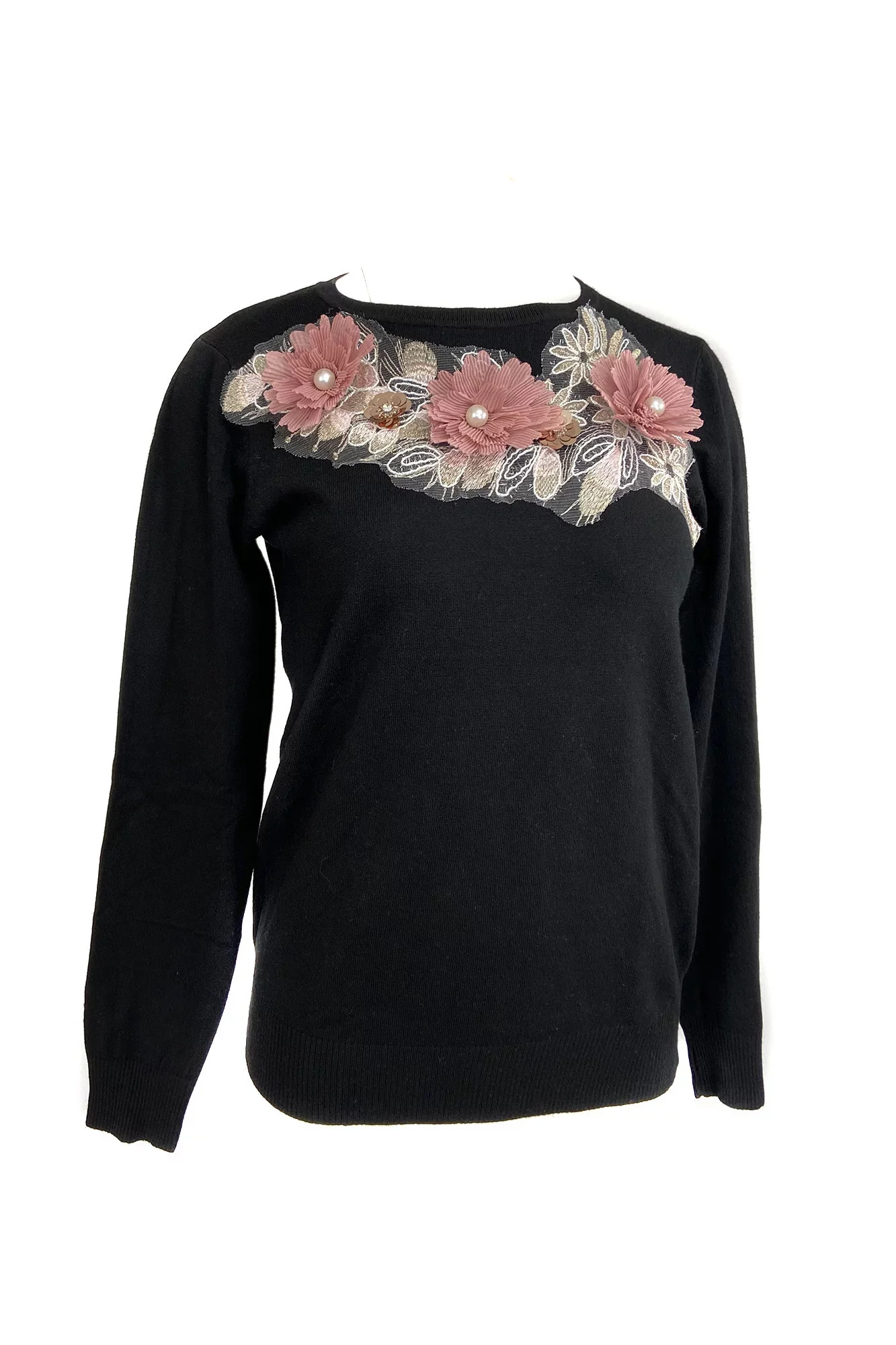 Dámský svetr na rukávech zdobený bílým plisovaným volánkem a černou stužkou SW 0202 - Gemini