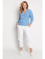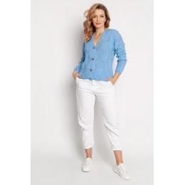 Prostorný kardigan se srdíčkovým výstřihem a velkými knoflíky. Volné a ležérní, díky jemné prolamované výšivce a kvalitní přízi získává elegantní charakter. Skvěle vypadá k jarním šatům a kalhotám.