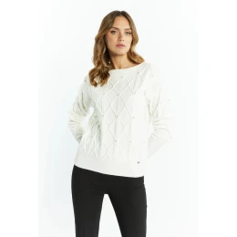 Dámský svetr s úpletem. Svetr s dlouhými rukávy a půlkruhovým výstřihem. Kromě toho je svetr zdoben malými korálky. Tento model bude jistě dobře fungovat v chladných dnech. Modelka na fotografii měří 177 cm a nosí velikost S.