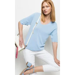 Tenký světle modrý svetr s volným výstřihem a 1/2 rukávy.