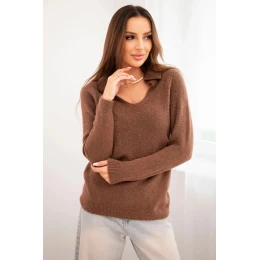 Dámský svetr z baby alpaky s límcem a V výstřihem čokoládový