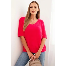 Dámský svetr z měkkého chlupatého materiálu s V výstřihem krátký rukáv růžový
