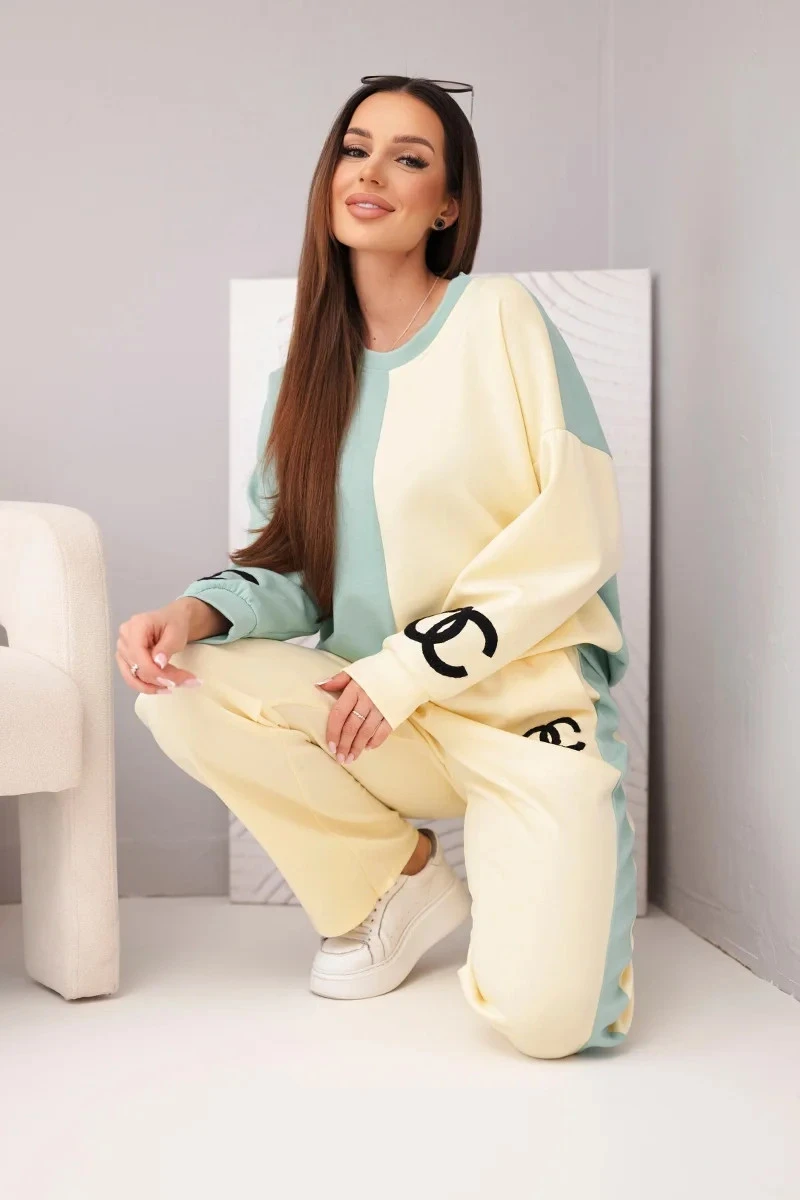 Dámský teplákový komplet Masełko dvoubarevný s oversized mikinou a rovnými kalhotami tmavě mátová+žlutá