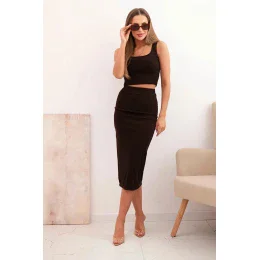- Střih: přiléhavý komplet – krátký top + midi sukně