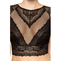Dámský top Ellba ROZA - černá barva - vyrobený z krajky a puntíkovaného tylu - průhledný výstřih - krajkové rukávky