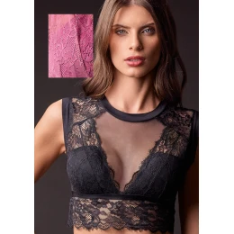Elegantní krajkový top Lormar spojuje jemnost, smyslnost a moderní design. Přední část zdobí výrazná krajka doplněná transparentním tylem, který vytváří působivý dekolt a dodává celému modelu lehkost. Zadní díl je tvořen kombinací jemné krajky a průsvitného tylu, což zajišťuje vzdušnost a rafinovaný vzhled. Top je navržen bez kostic pro maximální pohodlí a přirozený pocit při nošení. Dostupná růžová varianta odpovídá odstínu z ukázkových fotografií.