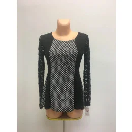 Dámský top - tričko v moderním designu s květinovými rukávy. Top je elegantní, volnějšího střihu a s černobílými čtverci. Tričko se hodí k džínám, sukni či ke společenským kalhotum. Velmi nápadité a zajímavé tričko / top, vyrobené z velmi elastické a příjemné tkaniny.