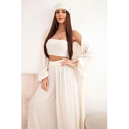 Dámský viskózový komplet je vynikající volbou pro ženy, které ocení pohodlí, lehkost a výjimečný styl. Tento efektní set se skládá z topu, širokých kalhot, dlouhého přehozu a šály, díky čemuž vytváří soudržnou a velmi ženskou stylizaci. Lehký materiál se krásně přizpůsobí postavě, zvýrazní její přednosti a zajišťuje plné pohodlí při nošení i v teplejších dnech. Model se skvěle hodí na prázdninové výlety, procházky, letní setkání, ale také na výjimečné příležitosti, kdy chcete vypadat módně a stylově, aniž byste se vzdaly pohodlí.