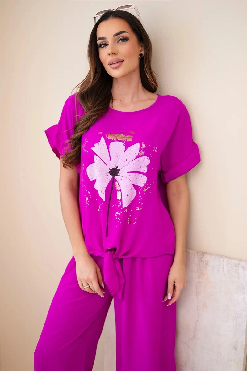 Stylový dámský komplet je vynikající volbou pro ženy, které si cení pohodlí a módního vzhledu. Set se skládá z volného topu s krátkým rukávem a širokých kalhot s komfortním střihem. Top vyniká efektním květinovým potiskem a asymetrickým spodním lemem, který dodává celku moderní a originální charakter.