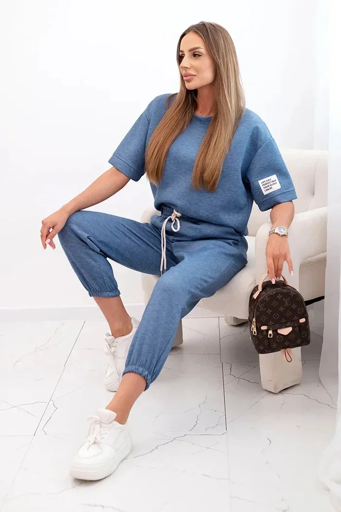 Dámský viskózový komplet s krátkým rukávem a nohavicemi džínový melír