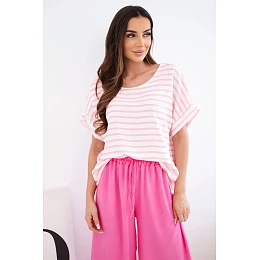 Dámský viskózový komplet s pruhovanou halenkou a širokými kalhotami s gumou růžový