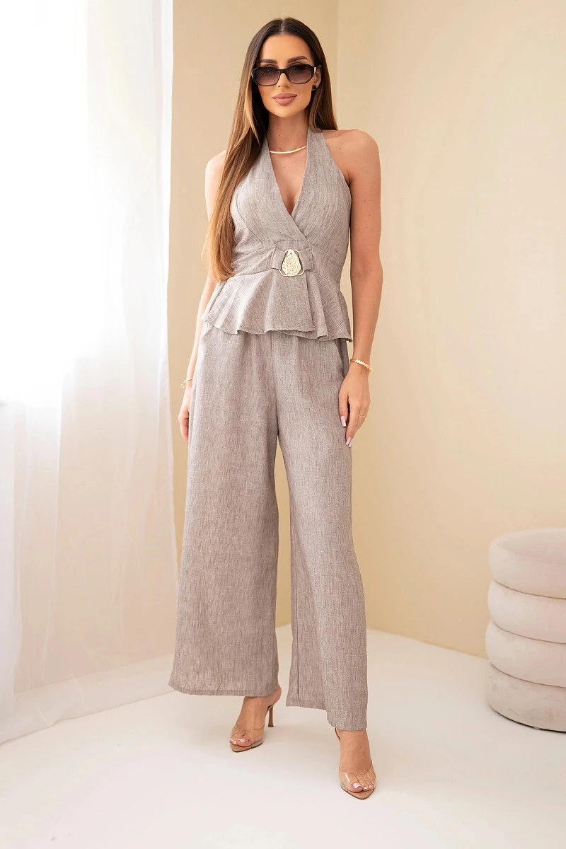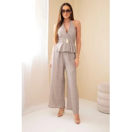 Elegantní a stylový dámský komplet je vynikající volbou pro ženy, které si cení módních a zároveň pohodlných řešení. Souprava se skládá z efektního topu a kalhot se širokou nohavicí, které společně tvoří souladný a velmi ženský outfit. Vrchní část kompletu se vyznačuje hlubokým výstřihem a zavazováním za krkem, což krásně zvýrazňuje postavu a dodává celku smyslný charakter. Dalším plusem je ozdobná přezka v pase, která formuje postavu a přitahuje pozornost.