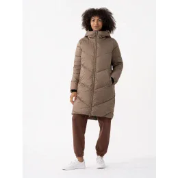 Dámský péřový kabát s výplní ze syntetického peří, díky čemuž zajišťuje optimální tepelný komfort v přechodném období. Kabát má dodatečný impregnační povlak, který chrání proti nadměrné absorpci vlhkosti zvenčí.