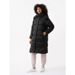 Dámský péřový kabát v oversize střihu s výplní ze syntetického peří poskytuje větší tepelný komfort a chrání záda a stehna. Zimní bunda má také velkou odnímatelnou kapuci a vysoký límec. Dvoucestný zip usnadní přizpůsobit spodní část kabátu, např. při jízdě autem. Díky odepínacím rukávům lze kabát proměnit v dlouhou vestu. Impregnovaný z vnější strany materiál podporuje ochranu proti nadměrné absorpci vlhkosti.