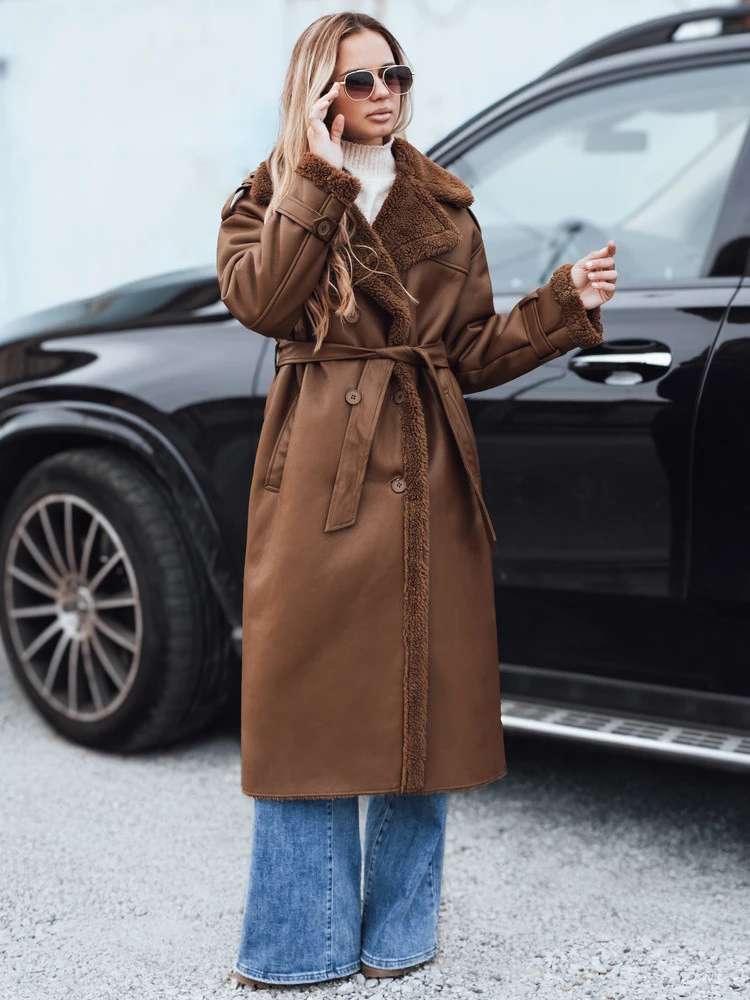 Stylový dámský kabát z ekokůže, zateplený měkkou kožešinou. Dlouhý střih, pásek v pase a elegantní provedení z něj činí módní volbu pro zimní a chladné dny. Ideální pro každodenní i večerní styling, zaručuje teplo a eleganci.