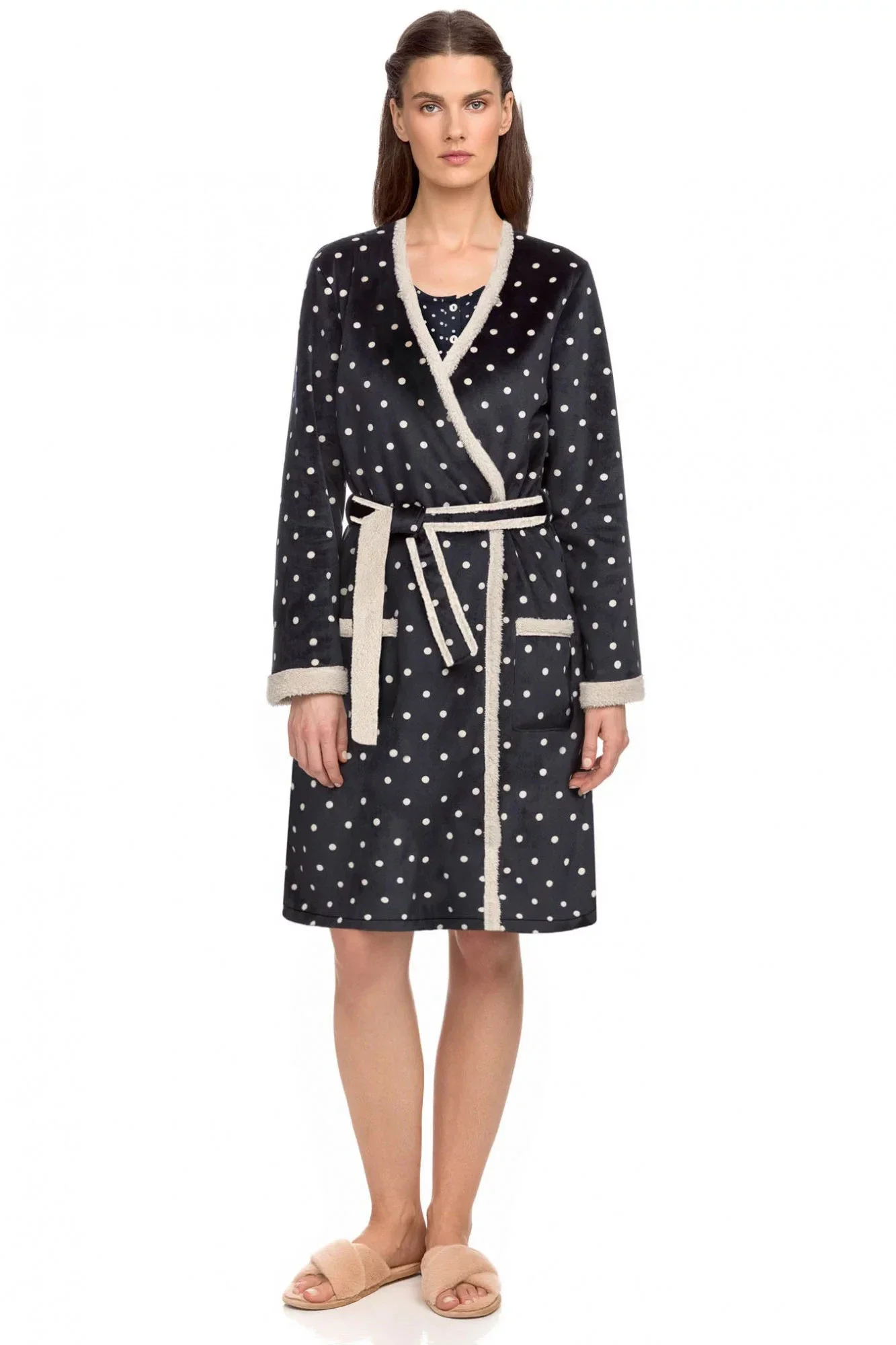 Pohodlný dámský župan pro krásné chvíle a pocit pohodlí. Tento župan s potiskem puntík, dlouhým rukávem a zavinovacím střihem je vyrobený z lehkého a hřejivého polyesterového vlákna, které je objemné, měkké a příjemné na dotek, dobře udržuje tělesnou teplotu a rychle schne.