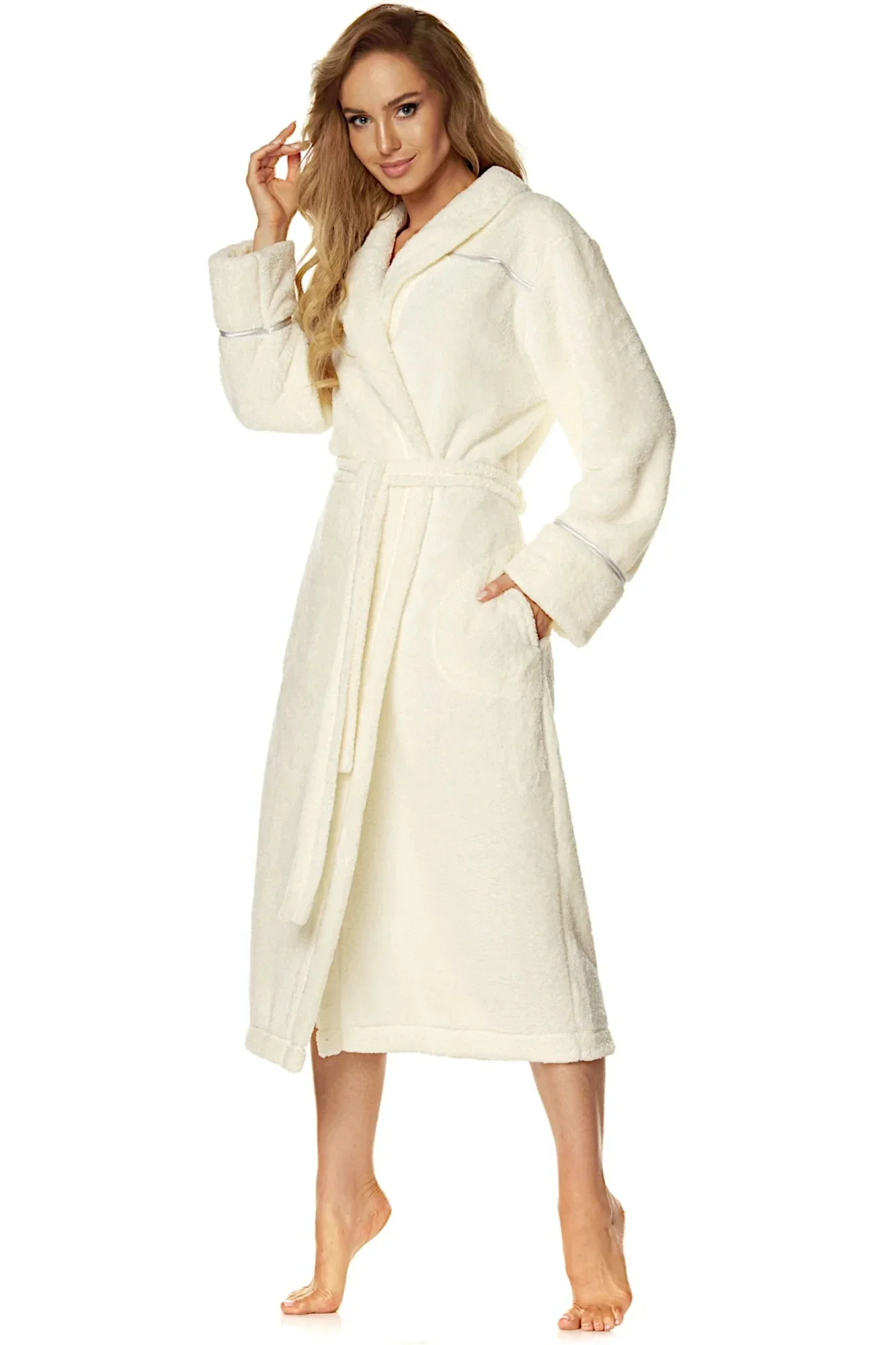 Dámský dlouhý župan 2084 L&L - velmi měkký a příjemný materiál na dotek - ozdobený saténovým prošitím - krémová barva - na bocích našité kapsy - šálový límec - zavazování na pásek