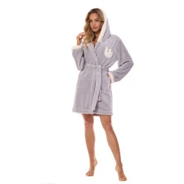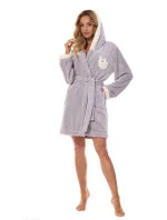 Dámský župan 2411 Lazy beige L&L - béžová barva - z měkkého materiálu typu soft - ozdobná aplikace na hrudi - na bocích kapsy - zavazování v pase na pásek - s kapucí - kontrastní lemování - krátký