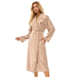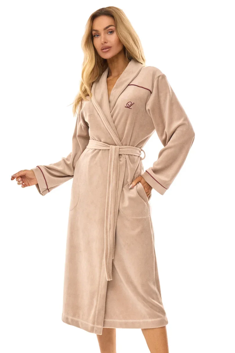 Seznamte se s výjimečným dámským županem 2508, který kombinuje elegantní vzhled s pohodlným nošením. Je vyroben z vysoce kvalitních materiálů - měkké bavlny s příměsí polyesteru - dokonale obepíná tělo a poskytuje teplo a pohodlí kdykoli během dne. Klasický střih se šálovým límcem a dlouhými rukávy podtrhuje nadčasovou eleganci. Jemná výšivka a kontrastní lemování dodávají decentní šarm. Praktické kapsy a zavazování v pase zajišťují funkčnost. Ideální pro chladná rána a večery - doma, v hotelu nebo při relaxaci v lázních.