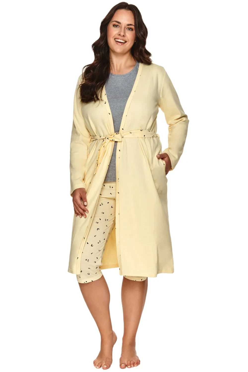 Dámský župan 2714 Taro - žlutá barva - vyrobené z vysoce kvalitní a měkké bavlny - s dlouhými rukávy - zavazování na pásek - délka nad kolena