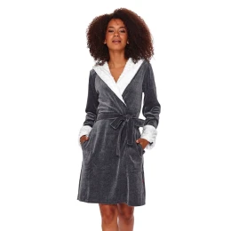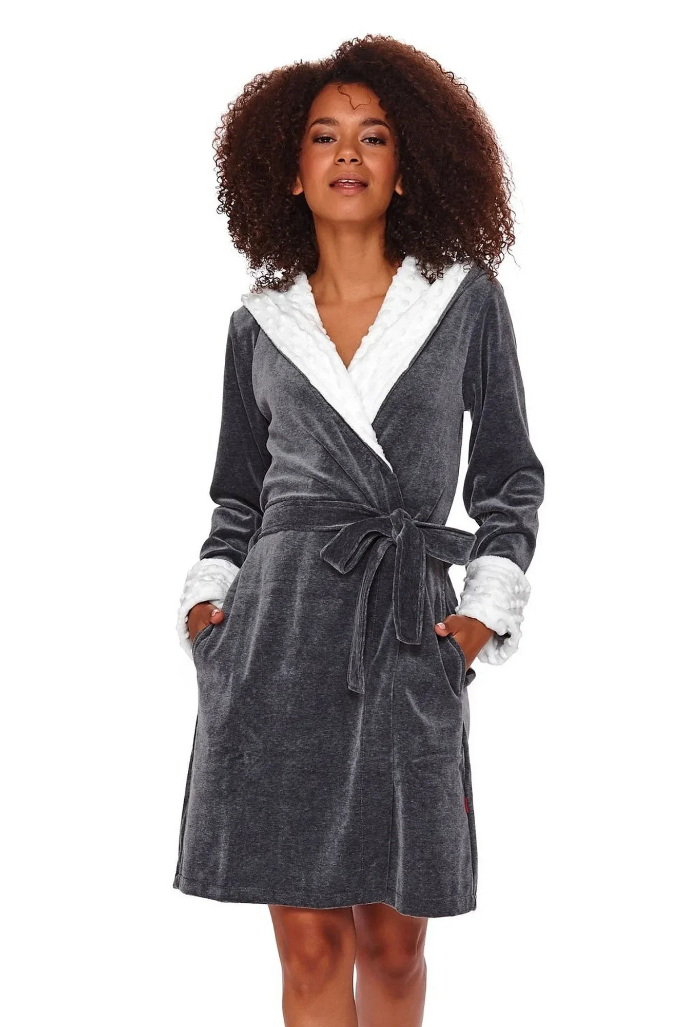 Dámský župan 7059 dark grey Doctornap - tmavě šedá barva - vyrobený z velmi kvalitní a příjemné bavlny - bílý široký límec - s kapucí - s kapsami - na zavazování v pase - délka nad kolena