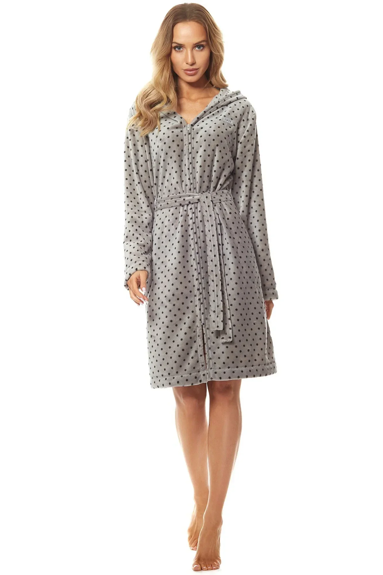 Dámský krátký župan 7119 L&L - velmi měkký a příjemný materiál na dotek - grafitová barva s černými puntíky - s kapucí - na bocích našité kapsy - zavazování na pásek - délka do poloviny stehen