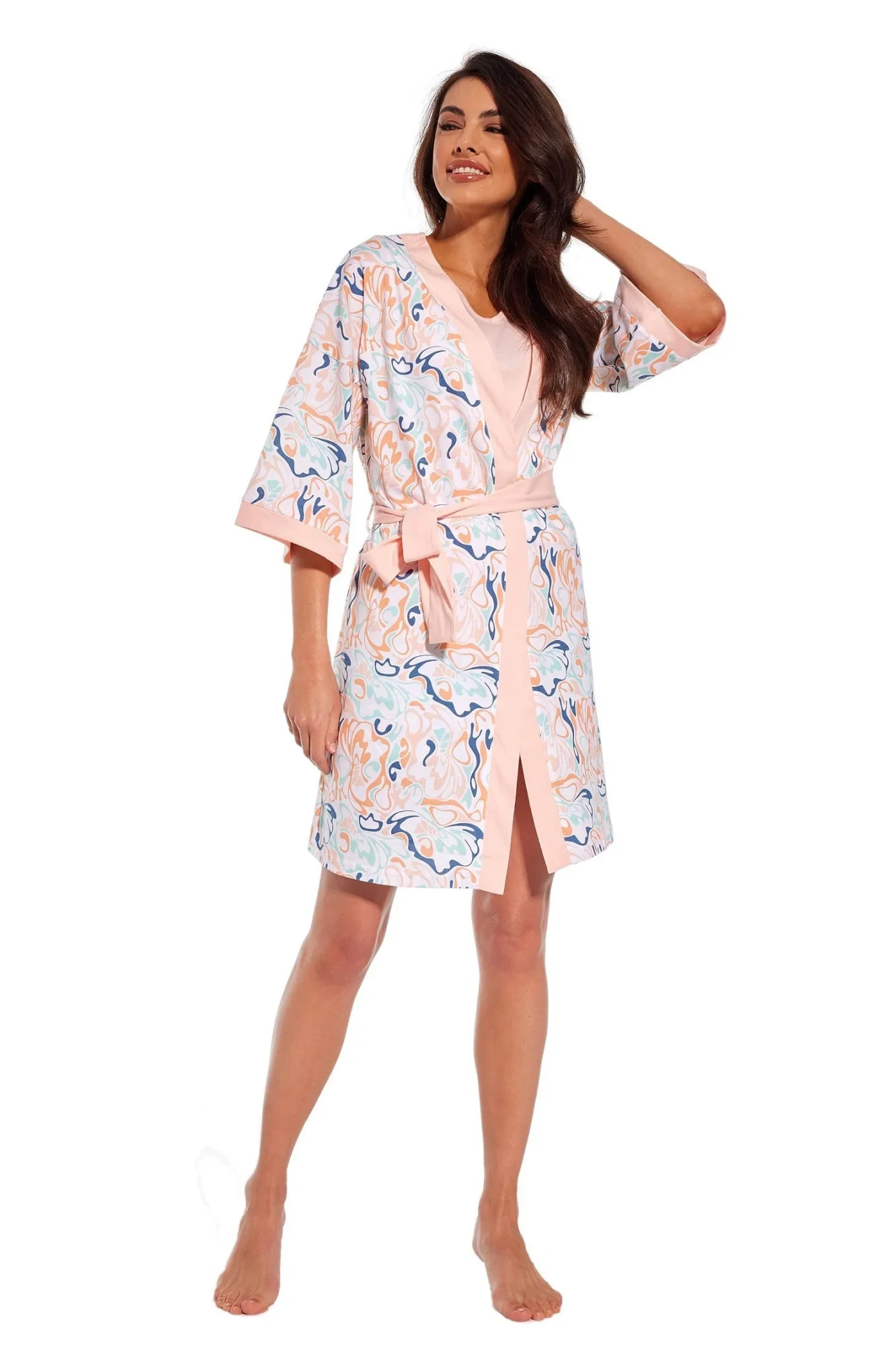 Dámský župan 742/279 Madlene CORNETTE - růžová barva - z vysoce jakostní bavlny - se vzorem - tříčtvrteční rukávy - vázání v pase - růžové lemování